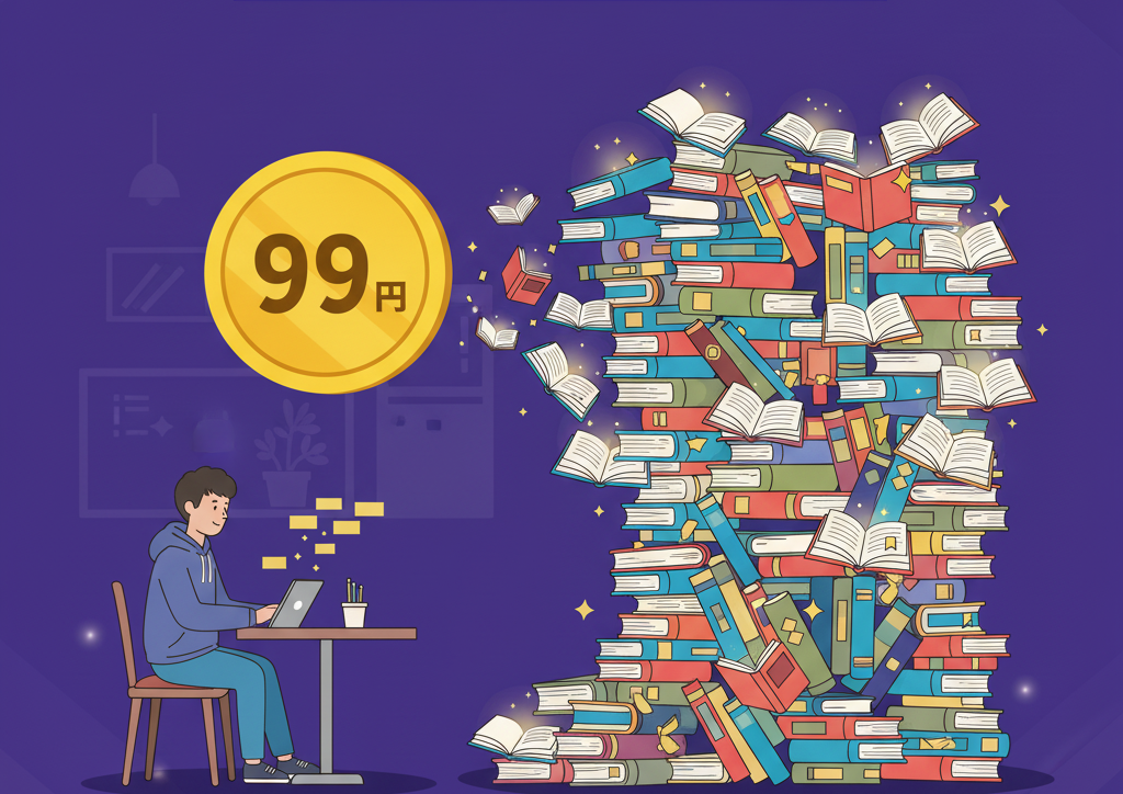 なぜなら、月額固定(今回は3ヶ月間、月額99円)で、200万冊以上の書籍にアクセスし放題になるからです。高価な専門書も、話題のビジネス書も、追加料金なしで読み放題。図書館のように「借りに行く・返しに行く」手間もありません。